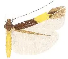 Male, female. Forewing length 3.5–4 mm. Head: frons shining white with greenish and reddish reflections, vertex and neck tufts brown with reddish gloss, medially and laterally lined white, collar brown; labial palpus first segment very short, white, second segment four-fifths of the length of third, brown with white longitudinal lines laterally and ventrally, third segment white, laterally with brown lines; scape dark brown with a white anterior line and a yellowish white dorsal line, white ventrally, antenna shining dark brown, a white line from base to beyond one-half, followed towards apex by an indistinct annulate section of approximately eight segments, three dark brown, three white, two dark brown, two white, ten dark brown and eight white segments at apex. Thorax and tegulae brown with reddish gloss, thorax with a white median line, tegulae lined white inwardly. Legs: dark greyish brown, femora of midleg and hindleg shining pale ochreous, foreleg with a white line on tibia and tarsal segments one to three and five, tibia of midleg with white oblique basal and medial lines and a white apical ring, tarsal segments one and two with white lateral lines from base on outside and connected to a dorsal white spot apically, segment three with a white line on the outside to beyond one half, segment five white dorsally, tibia of hindleg as midleg, tarsal segment one with white basal and apical rings, segment two with a white apical ring, segments three to five white dorsally, spurs white, ventrally ochreous-grey. Forewing brown with reddish gloss, five white lines in the basal area, narrower in female, a broad costal from one-third to the transverse fascia, a subcostal from base to one-third, slightly bending from costa, a short and straight medial above fold from one-quarter to two-fifths, a little longer subdorsal below fold, slightly further from base than the medial, a dorsal from or beyond base to the middle of the subdorsal, a broad yellow transverse fascia beyond the middle with a small apical protrusion, in female smaller as in male, bordered at the inner edge by two pale golden metallic tubercular subcostal and subdorsal spots, the subcostal spot outwardly edged by a small patch of blackish brown scales, the subdorsal spot slightly further from base and a little larger, bordered at the outer edge by two similarly coloured costal and dorsal spots, the dorsal spot three times as large as the costal, a white costal streak from outer costal spot, a shining white apical line connected to the apical protrusion, narrower and interrupted in the female, cilia brown around apex, brownish ochreous towards dorsum. Hindwing shining dark brownish grey, cilia brownish ochreous. Underside: forewing shining greyish brown, the white costal streak and apical line distinctly visible, hindwing shining brownish grey. Abdomen dorsally brownish yellow, ventrally grey, in the middle shining white, segments banded shining white posteriorly, anal tuft yellowish white, the female abdomen is dorsally greyish brown, mixed orange, segments banded greyish brown posteriorly, ventrally shining white, segment six greyish brown, anal tuft dorsally grey, ventrally whitish.[1]