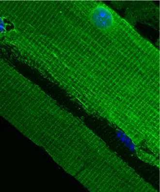 The costamere is a structural-functional component of striated muscle cells[1] which connects the sarcomere of the muscle to the cell membrane (i.e. the sarcolemma).[2]