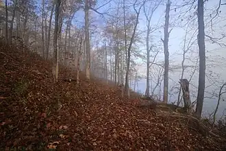 Council Bluff Recreation Area surrounds the lake.[2] The recreation area is 10,860 acres.[6] Funds were first allocated for the site in 1967.[6] The campground, called Wild Boar Campground, was opened in 1985.[3] There are also boat ramps available for use.[1] There is a sandy, 54,000 square foot beach called Chapel Hill Beach that is at the eastern part of the campground.[2] There is a 12-mile trail called Council Bluff Trail (also known as Lake Shore Trail) that encircles the lake and is connected to the campground. Camping, picnicking, hiking, fishing, waterfowl hunting, swimming, canoeing, and boating are some activities available.[2] Mountain biking is also available on the trail.[3] Boats must operate at no-wake speeds.[2][4] The lake has redear sunfish, bluegill, largemouth bass, and channel catfish that are available for fishing.[1]