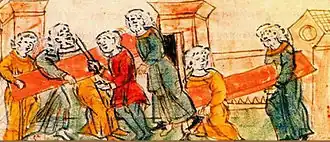 The kinsmen mounted their horses: Svyatopolk was with his military retinue and Davyd and Oleg each with their own retinues, but Davyd Igorevich remained on the sidelines since the others would not admit him to their presence while they discussed him. Once they made their decision, they sent messengers to him: Svyatopolk sent Putyata, Vladimir sent Orogost and Ratibor, and Davyd and Oleg sent Torchin.