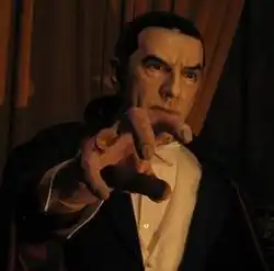 O. D. Woodward purchased rights to present Dracula on the West Coast, and the play opened at the Biltmore Theater in Los Angeles on 25 June 1928. The play was originally booked for a four-week engagement, but proved so popular that it was held over, closing on 18 August 1928.[9] The play would continue in other countries in 1929 such as Australia.[10] Lugosi would return to act in the play in 1933 after his appearance in the film Dracula (1931) and would return again to the play in 1941 for a two-year tour and again later in 1947.[11][12] A revival of the play by Leo Shull called Genius, Inc., opened in December 1942 featuring a Dracula with a Toothbrush moustache.[11] John Carradine took to the stage as Dracula in the early 1950s. When the play performed in Detroit, several accidents happened on stage leading audiences to laugh at what were supposed to be scary moments.[12] Frank Langella took on the role of Count Dracula, beginning 7 August 1967, an adaptation that William Gibson, director of the Berkshire declared to be "the worst play of the season".[13]