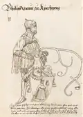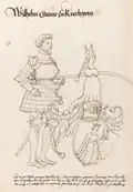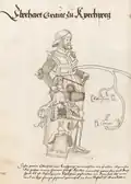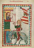 - Conrad of Kirchberg: Konrad is shown on the miniature 24r of the Codex Manesse as a knight (Graue Chunrat vo Kilchberg) who is giving his beloved a poem on horseback. 22 stanzas have survived, divided into three summer and three winter songs, which are reminiscent of Neidhart and Tannhäuser in terms of motif and form.[7] The historical person is uncertain; it is either Konrad (documented between 1255 and 1268) or his son of the same name (documented between 1286 and 1315).[7]