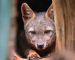 The crab-eating fox (Cerdocyon thous), also known as the forest dog, wood fox, bushfox (not to be confused with the bush dog) or maikong, is an extant species of medium-sized canid endemic to the central part of South America since at least the Pleistocene epoch.[1][2][4] Like South American foxes, which are in the genus Lycalopex, it is not closely related to true foxes. Cerdocyon comes from the Greek words kerdo (meaning fox) and kyon (dog) referring to the dog- and fox-like characteristics of this animal.[5]