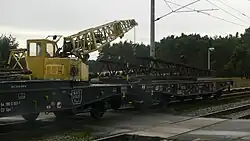 The largest cranes are used for accident recovery work, usually forming part of a breakdown train that includes staff accommodation and recovery equipment. These are large enough to lift derailed rolling stock back onto the track, although two or more cranes may be required to safely recover a locomotive.[2][3] In North American terminology, a 'breakdown crane' is often referred to as a 'wrecker' and the train of which it is a part is referred to as a 'wreck train'. The members of the crew that recovers the wrecked car(s) or locomotive(s) are referred to as 'wreckers'.