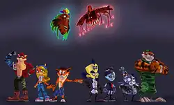 The audio was met with mixed responses, though reactions to the voice acting and humor were mostly positive. Thomsen praised the game's "kooky Danny Elfman-esque" score, exaggerated voice-acting, sophisticated writing and variety of enemy voice lines.[39] Davis and Grabowski felt that the voice cast was strong and lent a good amount of humor to the game.[30][34] Periera acknowledged the dialogue of the minion characters as funny but dated.[35] Rowe claimed that the game "might be the first script since Ratchet & Clank that made me laugh out loud", but considered Greg Eagles' performance as Aku Aku to be a "gratingly poor" impersonation of Aqua Teen Hunger Force character Frylock.[29] Knutson and Keller dismissed the soundtrack as forgettable and criticized the voice-acting as annoying; Keller elaborated that "Crash, who is supposed to be a deranged bandicoot, sounds more like a confused baby. Other characters such as Coco have really annoying voices that make you want to take a power drill to your temple to make the pain stop. The only voices that have any merit are the smaller creatures in the first five levels, who sound a lot like Jerry Lewis from The Nutty Professor".[33][40]