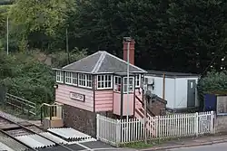 A plate girder footbridge links the two platforms and was erected in 1878. It has stone piers supporting four sets of wooden steps. The wide bridge has railings down the centre which allowed people on one side to cross between platforms, and on the other side to cross the line when the level crossing gates were closed across the road.[17] The signal box on the north side of the line beyond the level crossing dates from 1875[6] (although the listed building records suggests 1862)[18]