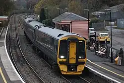 Passenger staff were withdrawn from the station in the mid-1960s and the goods yard closed on 4 December 1967.[6] The route to Plymouth had been closed from 6 May 1968 although a service from Exeter to Okehampton continued to operate until 3 June 1972 after which the line only carried traffic from the quarry at Meldon. Since 17 October 1971 the two tracks west of Crediton operated as two single lines, the former down line serving Okehampton and the former up line trains on the Barnstaple route.[9] From 17 December 1984 the line east of Crediton was also singled with trains to and from Exeter using a single track between Crediton and Cowley Bridge Junction.[10] Passenger services to Okehampton resumed on 20 November 2021, initially once every two hours but an hourly service was operated from 15 May 2022.[11][12]