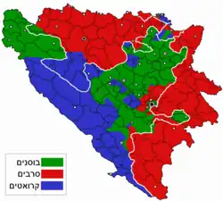 At the beginning of the war, JNA and VRS forces gained control of Serb-majority areas that were proclaimed part of Herzeg-Bosnia. By late 1992 Herzeg-Bosnia lost Kupres, most of Bosnian Posavina, and Jajce to VRS.[71] The territory under the authority of Herzeg-Bosnia became limited to Croat ethnic areas in around 16% of Bosnia and Herzegovina.[72] The arrival of Bosniak refugees from areas captured by the VRS to HVO-controlled parts of central Bosnia and Mostar altered the ethnic structure and reduced the share of Croats.[73][74]