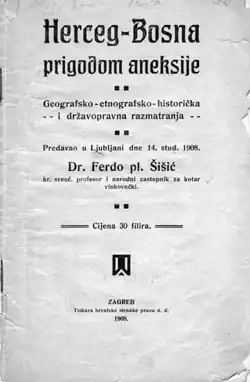 The term Herzeg-Bosnia (Croatian: Herceg-Bosna) appeared in the late 19th century and was used as a synonym for Bosnia and Herzegovina without political connotations. It was often found in folk poems as a more poetic name for Bosnia and Herzegovina. One of the earliest mentions of the term was by Croatian writer Ivan Zovko in his 1899 book Croatianhood in the Tradition and Customs of Herzeg-Bosnia. Croatian historian Ferdo Šišić used the term in his 1908 book Herzeg-Bosnia on the Occasion of Annexation. In the first half of the 20th century the name Herzeg-Bosnia was used by historians such as Hamdija Kreševljaković and Dominik Mandić and Croatian politicians Vladko Maček and Mladen Lorković. Its usage decreased in the second half of the 20th century until 1991 and the proclamation of the Croatian Community of Herzeg-Bosnia.[4] Since the 1990s, it has been used as a name for a Croat territorial unit in Bosnia and Herzegovina.[5]