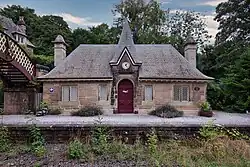 Known originally as Cromford Bridge, it was opened by the Manchester, Buxton, Matlock and Midland Junction Railway in 1849.[3] This is one of the few stations on the line that has been preserved and is a Grade II listed building. It is said to have been designed by G. H. Stokes, son-in-law of Joseph Paxton. It is believed that Stokes designed Station House (built in 1855), the extremely ornate former station master's residence opposite the station on the side of the hill as well as the ornate villa style waiting room, on what was the up platform. According to English Heritage,[4] this is the original station building; the present building on the opposite (down) platform was added by the Midland Railway at a later date.
