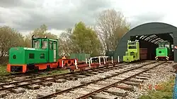 Between 1947 and the demise of commercial working, 23 internal combustion locomotives worked on the moors. All were 4-wheel vehicles, and they came from a variety of manufacturers. Nine locomotives were bought for preservation between 1992 and the close of the system. They were regauged to 2 ft 6 in (762 mm), and eight of them are in private collections,[23] while one Lister, works number 53977, built in 1964, was loaned to Doncaster Museum and Art Gallery in 2007.[24] One locomotive was abandoned at Bank Top around 1996, and it was this that sparked the idea for the railway. It was a 40 hp (30 kW) Simplex, manufactured by Motor Rail in 1967, with the works number 40s302, and bought new by Fisons.[25] When new, it had a fairly low cab, but a number of locomotives had their cabs extended upwards, to allow the drivers to stand up and see over the top of the wagons, and 40s302 was running with an extended cab and exhaust pipe by May 1992.[26] During restoration at North Lindsey College, the main bearing journals were found to be completely worn out, which was probably the reason for it being abandoned on the moors.[15] College members were unable to reassemble the locomotive at Crowle due to the Covid pandemic, and it was assembled by volunteers. This work was completed by 19 June 2021, when it ran under its own power again.[27] The restoration was shortlisted for the 2023 Heritage Railway Association awards, in the diesel and electric locomotion category.[28]