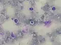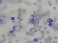| Micrograph of cryptococcosis showing the characteristically thick capsule of cryptococcus. Field stain. | |