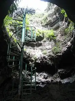 There are spiral metal stairs that allow one to descend to the interior of the crater.