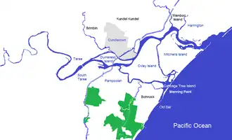 Cundletown (Birrpayi: Gindul)[3] is a town on the Mid North Coast, New South Wales, Australia. Cundletown and the nearby larger town of Taree were both settled in 1831 by William Wynter.[4] Cundletown had a population of 2,050 as of the 2021 census[1] and is a significant agricultural district. It is 16 km (9.9 mi) from the Tasman Sea coast, and 317 km (197 mi) north of Sydney.[4]