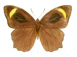 The branded evening brown is 75 to 85 mm in wingspan and broadly resembles the Melanitis evening browns, with a strong purple tinge above. The upper forewing has a narrow yellow apical band which does not reach the termen. The male has a large black brand on the upper forewing at the bases of 2 to 5 and the end cell.[3]