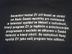 During the Czech TV crisis, ČT reporters organized an industrial dispute by staging a sit-in and occupying the news studio,[2] and rejected attempts by Bobošíková to fire them. They were supported in their protest by politicians such as the then President Václav Havel and by Czech celebrities, but every time they tried to air their news broadcasts, Jana Bobošíková and Jiří Hodač would interrupt the transmission either with a "technical fault" screen reading: "An unauthorized signal has entered this transmitter. Broadcasting will resume in a few minutes," or with their own news broadcasts featuring Jana Bobošíková and a team she had hired to "replace" the staff members she had sought to terminate; news content from Bratislava was also rebroadcast.[3]