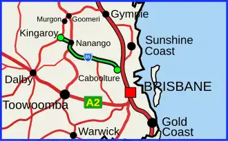 The D'Aguilar Highway is a two-lane highway linking the Bruce Highway near Caboolture with the Bunya Highway in Kingaroy in the state of Queensland, Australia. Major towns along the route include Woodford, Kilcoy, Blackbutt, Yarraman, and Nanango. The highway is approximately 164 km (102 mi) in length. The D'Aguilar Highway's highest elevation along its length is 527 m just north of Yarraman, and the lowest point is at 26.8 m just west of Caboolture.[1]