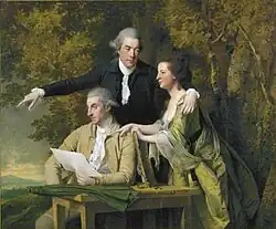 The family portrait on this page by Joseph Wright of Derby was painted about 1782, just after Coke and his wife had inherited Brookhill Hall, near Pinxton.[11] It shows them with Coke's cousin Daniel Coke at a table in the open air, under a large tree. The focus of the composition, and apparently the object of discussion, is a sheet of paper held by Daniel Coke, which may relate to the unseen landscape. Wright places D'Ewes Coke at the apex of a triangle, with his gaze towards his wife, while the other two look away from the small group. The meaning of the painting has been lost.[12] Coke became a member of Derby Philosophical Society which was formed when Erasmus Darwin moved to Derby.