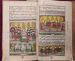 ![]() An 1875 reproduction of the Dabestan-e Mazaheb at the Salar Jung Museum, Hyderabad | |
