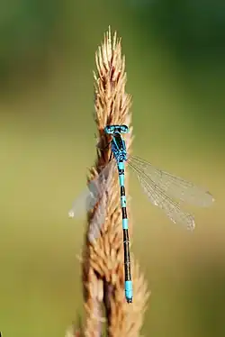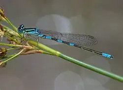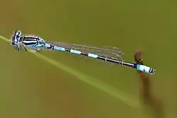 The dainty damselfly (Coenagrion scitulum), also known as the dainty bluet, is a blue damselfly of the family Coenagrionidae. This is a scarce species found mainly in southern Europe, northern Africa, southwest Asia, and Central America. C. scitulum are Odonata (dragonflies & damselflies) predators that can reach a length of 30–33 mm at maturity and have hind-wing lengths of 15–20 mm.[2] The males and females do exhibit differing features through their colouration making them easily distinguishable. As shown in the photo to the left, segment eight is blue in colour followed by black markings on segment nine, whereas the females are mostly black near the rear with smaller blue markings.[3] Although they are relatively simple to sex, they are easily confused with the common blue damselfly.[3]