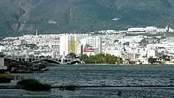 Dali Town (大理镇), formerly known as Tali,[a] is another division of Dali City, located 10 km (6.2 mi) north of Xiaguan. This town, commonly referred to as Dali Old Town (大理古城) to distinguish it from the city seat in Xiaguan, is usually the Dali referred to in tourist publications. The old town is one of the most popular tourist destinations in Yunnan, known for its natural scenery, historical and cultural heritage, and vibrant nightlife.[3]
