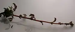 The midge induces stunted and distorted rosettes[4] in the host by inhibiting the elongation of the shoot; the rosette is formed from many (8 to 40 or more) slightly thickened and deformed leaves with reduced petioles. Many of the leaves have small green or red ligulate excrescences or projections. The midge larvae are of an orange-red colour.[1][2]