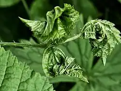 Signs of Dasineura plicatrix are contorted, young bramble leaves, which are found in the spring and early summer. The leaves can be creased, pleated or pluckered, with thickened veins, and conspicuous black staining around the gall. The white larvae can be found until early summer when they drop out of the galls and pupate in the soil. There is disagreement in the literature as to whether there is a single generation a year or several per year. The gall is often overlooked as just a crumpled leaf.[2][3][4]