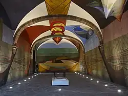 When the mural planned for the Hotel de la Selva in Cuernavaca was moved to Mexico City and expanded, he assembled a team of national and international artists to work on the panels in his workshop in Cuernavaca.[36] This project, his last major mural, is the largest mural ever painted, an integrated structure combining architecture, in which the building was designed as a mural, with mural painting and polychromed sculpture. Known as the Polyforum Siqueiros, the exterior consists of 12 panels of sculpture and painting while the walls and ceiling of the interior are covered with The March of Humanity on Earth and Toward the Cosmos.[36] Completed in 1971 after years of extension and delay, the mural broke from some previous stylistic mandates, if only by its complex message. Known for making art that was easily read by the public, especially the lower classes, Siqueiros' message in The March is more difficult to decipher, though it seems to fuse two visions of human progress, one international and one based in Mexican heritage.[37] The mural's placement at a ritzy hotel and commission by its millionaire owner also seems to challenge Siqueiros' anti-capitalist ideology.[37]