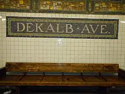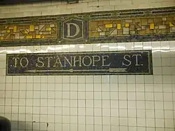 The mosaic tile bands are predominantly green and blue, with yellow and tan accents.[20] Those installed on the stairway from the mezzanine to the Manhattan-bound platform in Summer 2000 feature a seven-inch entrance motif design with a dull green and blue background.[20] The trim line has "D" tablets on it at regular intervals to represent "DeKalb."
