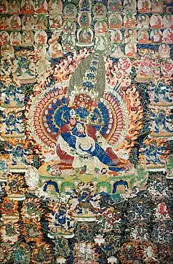 The fundamental practice of Vajrayana and Tibetan tantra is deity yoga (devatayoga), a form of Buddhist meditation centered on a chosen deity or "cherished divinity" (Skt. Iṣṭa-devatā, Tib. yidam). This involves the recitation of mantras and prayers alongside the detailed visualization of the deity and their mandala—a sacred configuration that includes their Buddha field, consorts, and attendant figures.[1] The 14th-century scholar Tsongkhapa stated that deity yoga is the distinctive feature that sets Tantra apart from the Sutra-based path.[2]