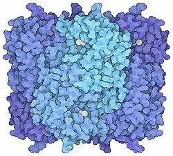 The allosteric magnesium ion lies at the highly hydrated interface of two pro-octamer dimers. It appears to be easily dissociable, and it has been shown that hexamers accumulate when magnesium is removed in vitro.[8]