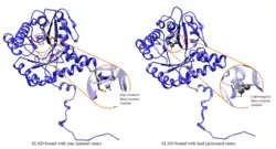 Aminolevulinic acid dehydratase (porphobilinogen synthase, or ALA dehydratase, or aminolevulinate dehydratase) is an enzyme (EC 4.2.1.24) that in humans is encoded by the ALAD gene.[5][6] Porphobilinogen synthase (or ALA dehydratase, or aminolevulinate dehydratase) synthesizes porphobilinogen through the asymmetric condensation of two molecules of aminolevulinic acid. All natural tetrapyrroles, including hemes, chlorophylls and vitamin B12, share porphobilinogen as a common precursor. Porphobilinogen synthase is the prototype morpheein.[7]