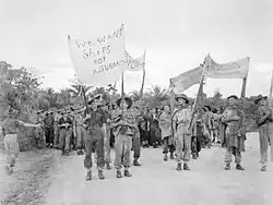 Many men in the SWPA believed that the demobilisation process was too slow. On 10 December 1945 4,500 men at Morotai in the Netherlands East Indies staged a protest march demanding that shipping be made available to return them to Australia.[15] Soldiers at Bougainville also complained about having to remain on the island after the war had ended, and Prime Minister Ben Chifley's plane was sabotaged in an apparent protest during his visit on 27 December 1945.[16] Minister for Defence Frank Forde was largely blamed for the slowness with which military personnel were being demobilised. As a result, he lost his seat at the 1946 election though the Labor Party itself comfortably retained office.[17]