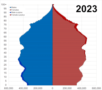 | 65 and over | 0.85 male(s)/female (2024 est.)[5] |