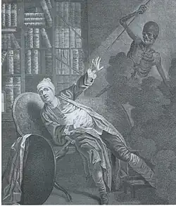 Just outside the entrance to the wood was a small hermitage known as The Temple of Death.[12] It had a thatched roof and internal enclosures formed by fake stonework panels,[15] each covered in verses reminding the reader of "the vanity, the shortness and insufficiency of human pleasures".[16] To the right-hand side of the temple entrance, hidden out of sight, was a clock that chimed every minute, which in the words of William Bowyer, was "admonishing us that Time is fleeting, and even the least portion of it to be employed in reflections on Eternity";[16][17] it was faced on the opposite side by a large white raven with a label in its mouth conveying the same message.[12] Chained to a sloping desk in the centre of the temple was a copy of Edward Young's poem Night-Thoughts and Robert Blair's The Grave, bound in black leather.[12]
