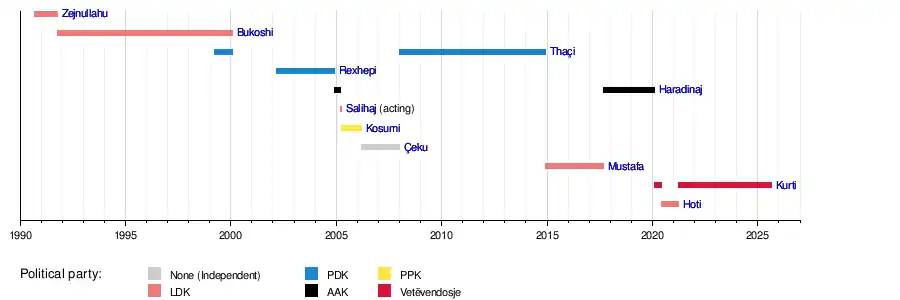 | 2 | Bujar Bukoshi (1947–2025) | 5 October 1991 | 1 February 2000 | 8 years, 119 days | LDK | — | |