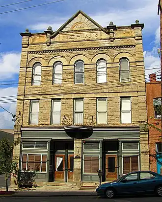 Dering Building is a historic commercial building located at Morgantown, Monongalia County, West Virginia. It was designed by noted Morgantown architect Elmer F. Jacobs and built in 1896. It is a three-story Romanesque Revival style brick building. It has a rectangular plan, a flat roof, separate store fronts, and recessed portico entrances. It features a pediment above the flat roof with a rising sun motif and the date of construction inscribed in the center.[2]