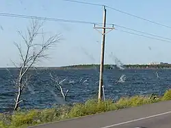An increase in precipitation between 1993 and 1999 caused the lake to double in size, forcing the displacement of more than 300 homes and flooding 70,000 acres (28,000 ha) of farmland.[15] The Spirit Lake Tribe, whose reservation is along part of the lake, suffered considerable damage to homes and lands. Attempts to mitigate the flooding have reportedly cost North Dakota and the U.S. government more than $450 million. Efforts to control flooding include artificial outlets, dike construction and moving railroad lines, roads, and power lines.[16] Future climate as projected by 17 different global climate models indicates overall increase in both precipitation and temperature in the Devils Lake region leading to the lake's overspill probability (24–47% without the outlet and 3.5–14.4% with the full capacity outlet) into the nearby Sheyenne River.[17]