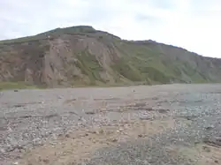 The cliff above the beach is known as Boncan Dinas and is occupied by an Iron Age hillfort, Dinas Dinlle itself. This fort has been eroded by the sea, such that only a double semi-circular rampart remains. Finds of Roman pottery suggest reoccupation in the 2nd or 3rd centuries CE.[1] The fort is now (after centuries of erosion from the west) about 150 metres from north to south, 110 metres east to west, with an entrance on the south west.[2]