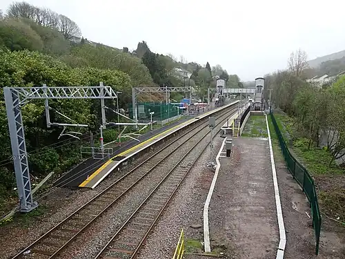Dinas Rhondda railway station is a railway station serving the Dinas, Penygraig and Trealaw districts of Tonypandy, Wales. It is located on the Rhondda Line.