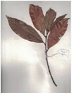 This is an evergreen, dioecious tree species that grow up to 18 meters in height. The bark is 10–12 mm thick, black, and smooth, with a yellow blaze. The branchlets, young leaves, and inflorescences are densely covered with rufous tomentose. Leaves are simple, alternate and without stipules.[1] The petiole is 6–12 mm long and glabrous. The lamina is elliptic, oblong-lanceolate, or ovate in shape, with an attenuate base, an acuminate apex, and an entire margin. The leaves are densely rufous tomentose when young, and glabrous when mature.