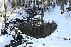 The Ditz has its source at about 675 m above sea level in the slope debris below the Schläfhalde in a side valley between the Schloßberg with the Hiltenburg and the Oberbergfels. On the upper reaches the stream bed has numerous tufa terraces over which the water flows in small waterfalls. the tufa terraces have been designated as natural monuments. Just before it reaches Bad Ditzenbach, the Badwiesenbach flows towards it on its right side. In Bad Ditzenbach it finally flows into the upper Fils from the right at a height of about 504 m.