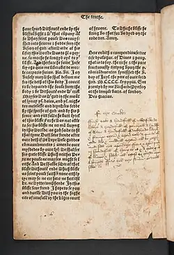 ![]() Final page of printed Dives and Pauper with colophon providing title and imprint details. A 16th-century manuscript note gives a recipe supposed to cure “the canker”. | |