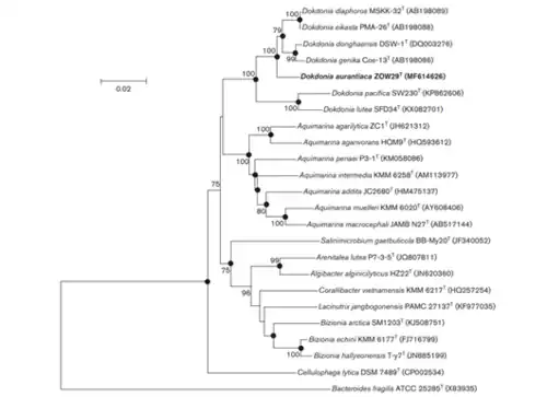 - ^ a b Choi S, Kang JW, Kim MS, Yoon JH, Seong CN (May 2018). "Dokdonia aurantiaca sp. nov., isolated from seaweed Zostera marina". International Journal of Systematic and Evolutionary Microbiology. 68 (5): 1697–1701. doi:10.1099/ijsem.0.002730. PMID 29570445.