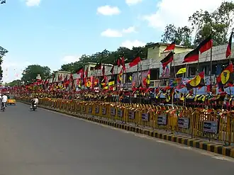 The party at its inception retained the flag of the South Indian Liberal Federation, which had a picture of a traditional type of balance signifying the idea of equality.[30] Its central theme was to remove the degraded status imposed on Dravidians. To communicate this, the party adopted a black flag with a red circle inside it, with the black signifying their degradation and the red denoting the intention of the movement to uplift Dravidians.[31]