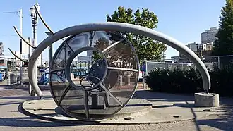The galvanized steel sculpture by Don Merkt is installed at the intersection of Northwest 5th Avenue and Irving Street has been, along the Transit Mall in Old Town Chinatown. It has described as a "large abstracted eye" that focuses on Portland Union Station's clock tower, "or more metaphorically time".[1] The artwork measures 10 feet (3.0 m) x 27 feet (8.2 m) and is categorized by the Smithsonian Institution as both abstract and architectural.[2] Behind the eye's iris is a steering wheel and seat, accessible to visitors. The seat's reverse is an inverted replica of the clock face.[1][2] Merkt has described the work as being about "social responsibility and that shared sensation of steering something greater than yourself through time, whether it be a bus, a family, a community or a culture. The sculpture can be seen as a collective 'I' or 'eye', a living populist sculpture that cameos whoever takes the wheel."[1]