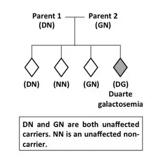 Duarte galactosemia is inherited as a Mendelian autosomal recessive trait. A child with DG carries two different types of GALT alleles, one inherited from each parent. One of these GALT alleles, the G allele, carries a mutation that severely inhibits the function of the encoded GALT enzyme. The other GALT allele, called the D or D2 allele, carries mutations that partially compromise the expression and change some biochemical properties of the encoded GALT enzyme. Together, the G and D alleles only produce about 25% of the normal level of GALT enzyme activity found in a person with two normal (N) GALT alleles.[1] Both parents of a child with DG are considered carriers for GALT variant alleles. One parent carries the G allele and the other carries the D allele. The genotypes of these parents would be written GN and DN, respectively. Without follow-up testing of the parents, it is not possible to know which parent contributed which GALT allele to a child with DG. Like other autosomal recessive conditions, the recurrence risk for DG is 1 in 4, meaning that for each successive child born to parents who already have a child with DG there is a 1 in 4 chance the new baby will also have DG (Figure 2). In rare cases, one parent may actually have DG, while the other parent is a carrier for a G allele (GN). For these couples, there is a 1 in 4 recurrence risk for DG and also a 1 in 4 risk with each pregnancy that the new baby will have classic galactosemia (GG). In extremely rare cases a GALT gene mutation may arise de novo, so that only one parent is a carrier; however, only one case of this has been reported in the literature for galactosemia.[6]