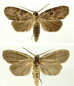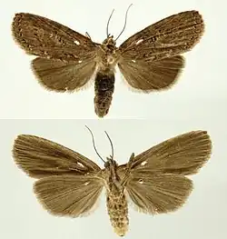 The length of the forewings is 16.4–17 mm. The dorsal ground color is a mixture of gray-brown, blackish-brown and beige scales. The veins are lined with gray, especially distally. The anal fold and cubitus are blackish brown and the orbicular spot is diffuse blackish brown. The reniform spot is small and blackish brown. The ventral surfaces of both wings are gray brown and the dorsal hindwing is dirty gray brown, but lighter near the base.[1]