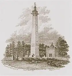 The original land lighthouse was commissioned by Sir Francis Dashwood[2] (better known as the founder of the Knights of St Francis, which became the Monks of Medmenham, later called a Hellfire Club) in 1751 as a gift to his wife Sarah (Ellys) Dashwood, who feared crossing the dark heath near her childhood home, Nocton. The purpose of the land lighthouse was to improve the safety of 18th-century travellers crossing a particularly treacherous area of the county known for its many incidents of robbery by highwaymen. In the 1843 Journal of the Agricultural Society it was described as the "only land light-house ever raised".[3]