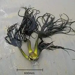 The blades of Durvillaea antarctica are green to golden brown with a leathery texture. The honeycomb structure of the blade gives strength and buoyancy.[7][8] This novel structure is thought to be responsible for the wide distribution of this genus, as the kelp is able to float when its holdfast fails. It can colonise other coastlines in this manner, and has been shown to carry communities of invertebrates across vast ocean distances from one shore to another.[9] Specimens of D. antarctica have been found to float for up to 210 days, during which time high wind speeds transport kelp rafts up to 10,000 km.[10] Environmental factors such as temperature, solar radiation and surface winds (all of which vary with latitude) affect buoyancy of rafts and their rate of travel.[10] Rafts of D. antarctica are more likely to disperse offshore if plants detach during outgoing tides during autumn and winter.[11] It is thought that this 'rafting' with Durvillaea antarctica and other floating seaweeds allowed a wide range of species to recolonise sub-Antarctic shores scoured clean by ice during the last Ice Age.[12]